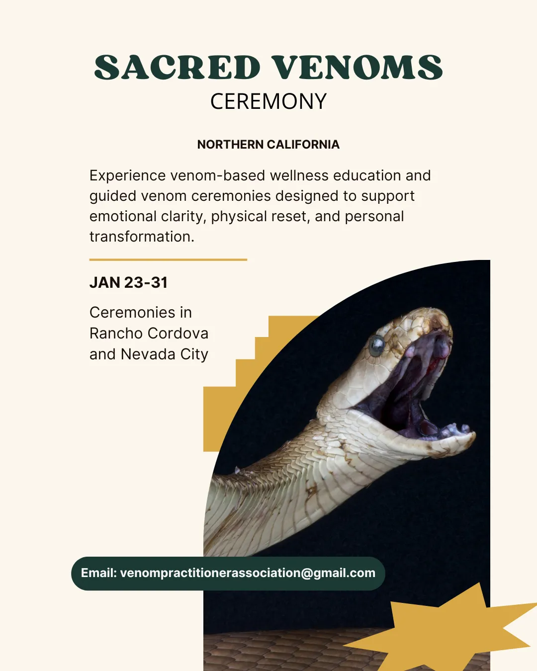The information, services, and events provided by Sincere Seven (including but not limited to teachings, courses, ceremonies, venom therapy, and/or entheogenic experiences) are intended for educational, spiritual, and personal development purposes only.